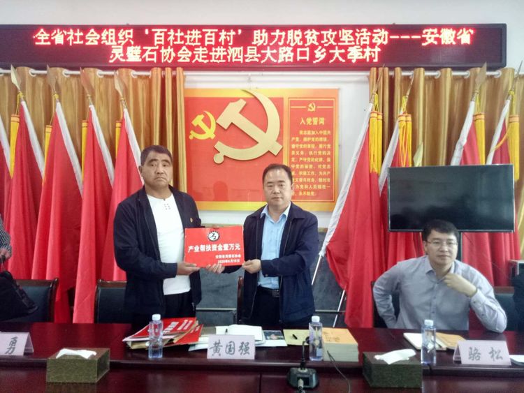 为贯彻落实党中央、习近平总书记决胜全面建成小康社会, 决战脱贫攻坚总体战略部署, 积极完成全省社会组织“百社进百村”助力脱贫攻坚活动工作任务, 安徽省市灵璧石协会高度重视, 迅速行动, 按照活动要求, 在产业帮扶、教育扶贫、文化扶贫、公益扶贫、信息服务等方面认真开展工作, 全力以赴投入脱贫攻坚战役, 为中华民族伟大复兴贡献一份力量。