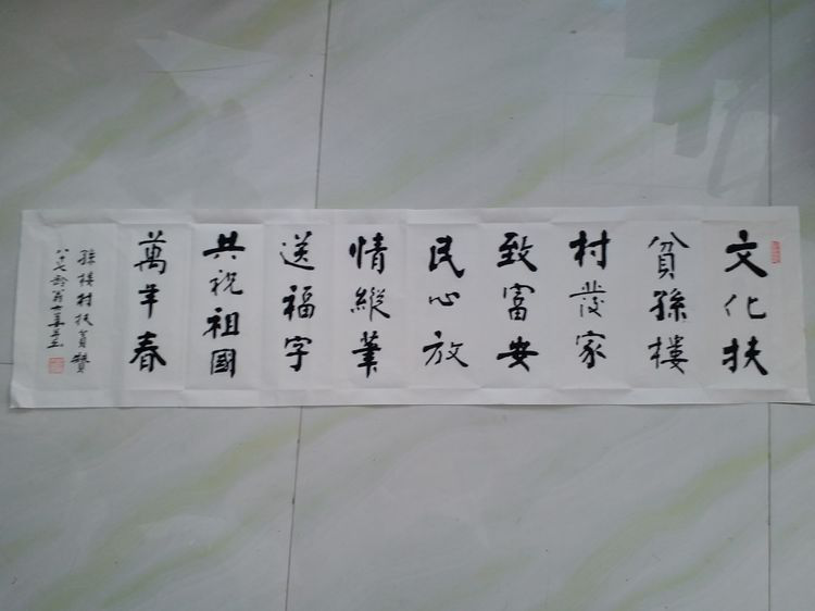 郭大华老师即性赋诗一首, 诗曰:文化扶贫孙楼村,发家致富安民心,放情赠笔送福字,共祝祖国万年春