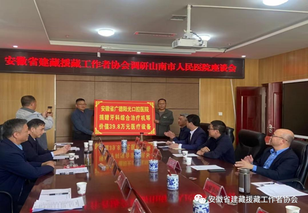 西藏山南市人民医院举行了隆重的受捐仪式,山南市委副书记、常务副市长、安徽省第七批援藏工作队总领队汪华东,山南市人民政府副秘书长佘海舟,山南市卫生健康委党组成员、副主任石磊等出席捐赠仪式。山南市人民医院党委副书记、院长许力致欢迎词并介绍了2021年9月广德阳光口腔医院第一批捐赠的69.8万元设备使用情况;医院党委书记、副院长吾根单增代表山南市人民医院接受了协会副会长单位——广德阳光口腔医院的第二批总价值39.8万的口腔医疗设备的捐赠,并授予捐赠证书。